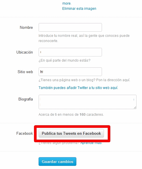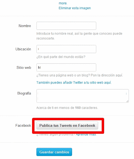 - Una vez cambiado el perfil por la pagina de Facebook, dirigete a Twitter/configuracion/ Perfil, abajo dice Facebook, dirigete allí y da click en "Publica tus Tweets en Facebook", y sigue todos los pasos de la siguiente imagen: